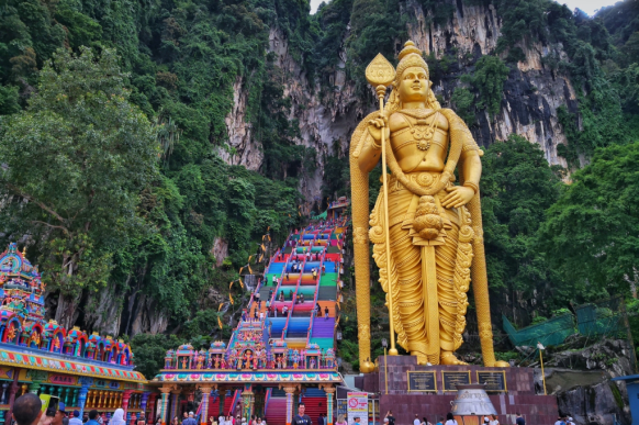 A famous limestone hill and Hindu temple complex. The 272 colourful steps lead to the main cave temple, guarded by a massive golden statue.